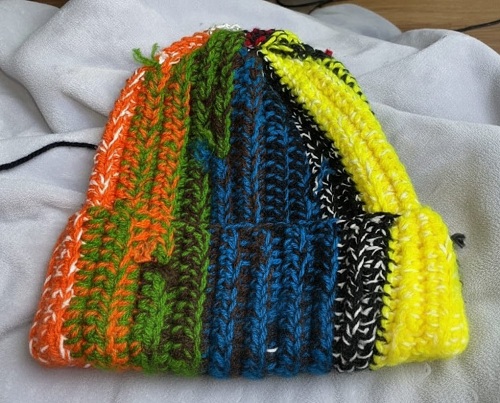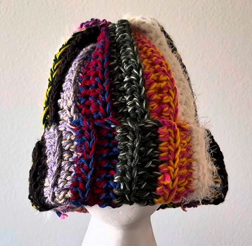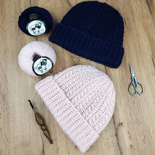 This crochet hat, with its folded brim, looks like a knit pattern, crocheted in rows from side to side. Myhobbyiscrochet uses ch, st, hdc, and more crochet stitches in this.