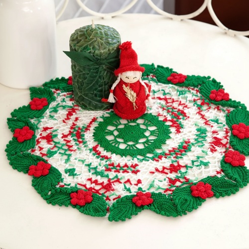 If looking for a lacy Christmas project or any other occasion, this variegated doily is perfect for a year-round accent. It is 16″ in size. Shared by Yarnspirations.