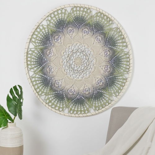This Doily Dream catcher is stitched from the centre outwards in joined rounds using advanced crochet methods. Julia Hart is behind the creation.