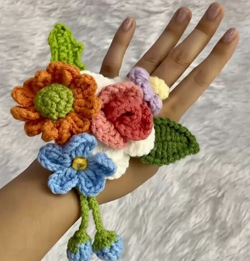 Bridesmaid Bracelet includes rose, leaf, daisy, puff flower, forget me not, and more to design the shown result. Kane Crochet made this.