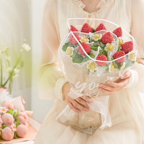 First, crochet the strawberries, then the flowers, leaves, stuffing, and assemble. Susudiy’s stitching guidance will help.