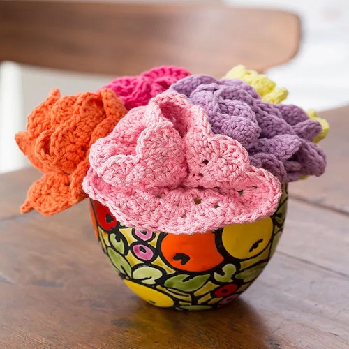 Dishcloths Bouquet is crocheted in rounds using ch, dc, sts, and other stitches. Read the details from Michele Maks’ PDF.