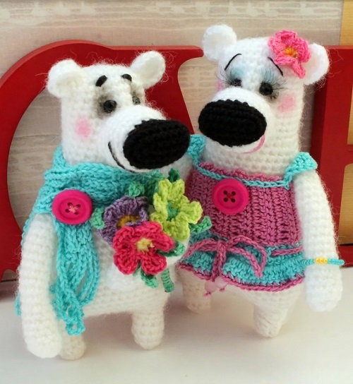You need mohair 40 % white yarn for the bear body, a 2.5 mm crochet hook, and other materials to begin with this toy. It is 15 cm tall. Designed by Marina Chuchkalova.