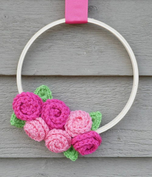 The Rose Bouquet Crochet Hoop Wreath uses a 5.0 mm crochet hook, ribbon, hot glue, scissors, tapestry needle, and other supplies. Shared by Fiberfluxblog.