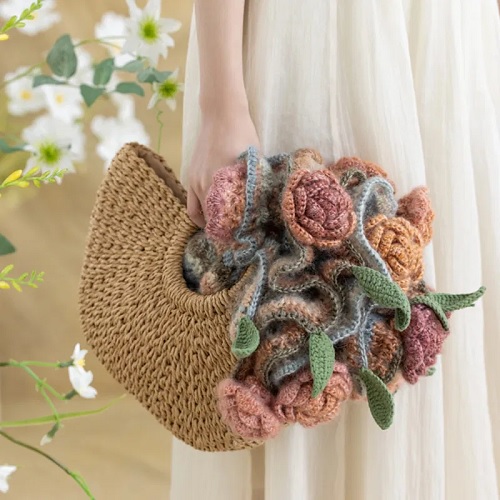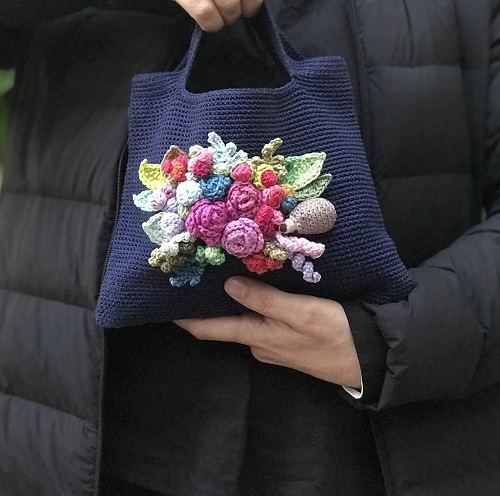 Moran’s handbag holds a joyful bouquet on its front. Want to have the same? Gather a crochet hook, yarns, and other supplies to begin.