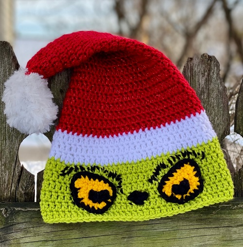 Melissa has created this unique blend of Santa and the Grinch winter hat. It is designed using different yarn, fun expressions, and more details.
