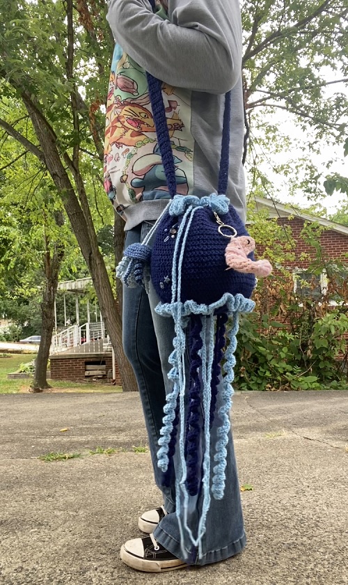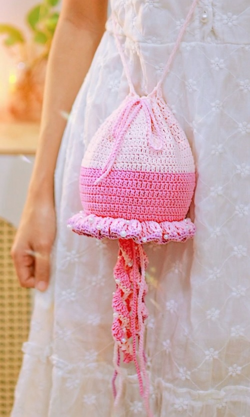 Chenda DIY stitched it row by row buliding the base, body, the added strap, string tie, ruffled edges, tentacles, and more. Watch to know.