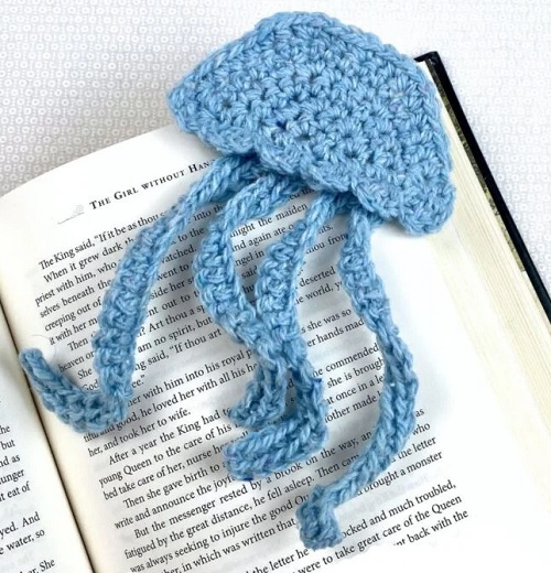 Blue jellyfish crochet bookmark pattern is 4 inches and can live on your books, covering the corner. HA! Crochet it with the hidden intermediate skills of yours with April Garwood.