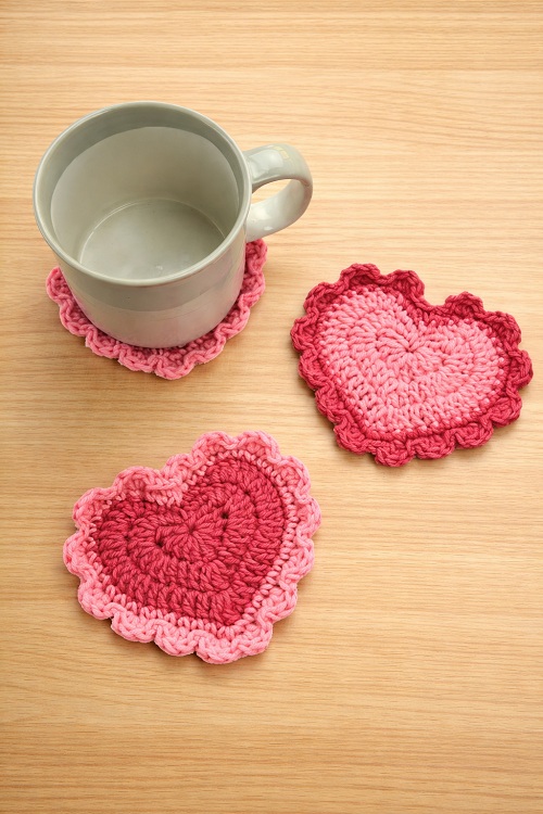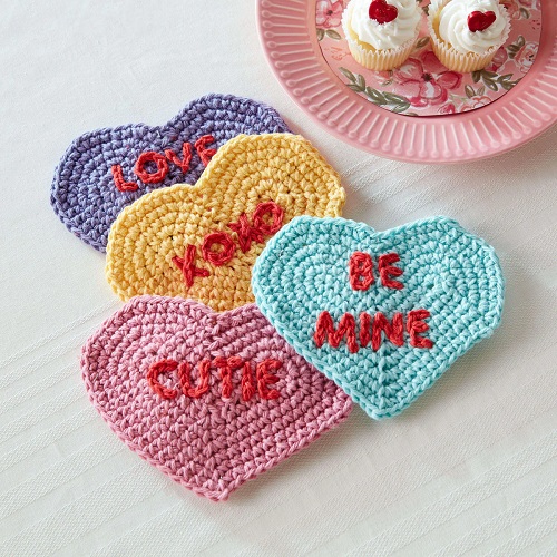 Design these adorable single-color coasters and stitch your love message on top. Each one uses ch, pat, sc, sl st, and more techniques. By Yarnspirations.