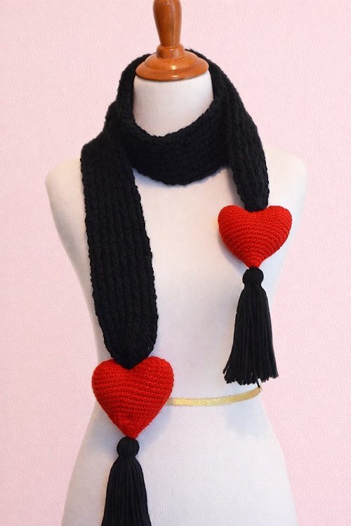 Looking for an easy crochet pattern? Then try this scarf with heart-shaped fringe. A perfect item to gift your loved one on his valentines day. From Yanspirations.