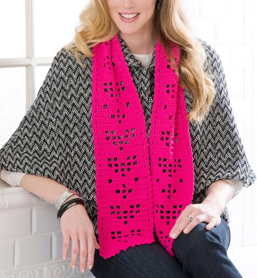 This beautiful red heart scarf, designed by Yarnspirations, is approximately 7 x 65 inches. All you need to work on stitches like ch, sc, dc, hdc, sl st, and many more. View!